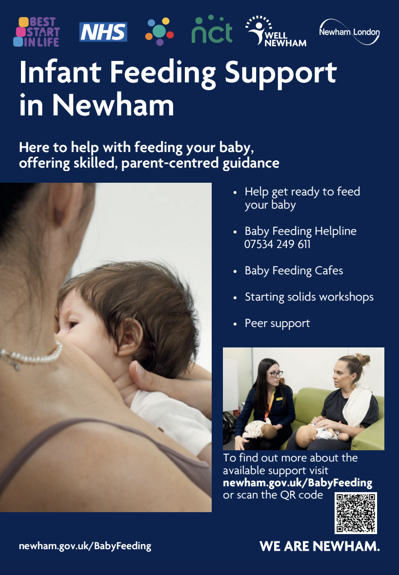 Our Infant Feeding Team are skilled and experienced specialists here to support you with breastfeeding, bottle feeding, mixed feeding, and much more. For 1-1 help 7 days a week via Newham Baby Feeding Helpline 07534 249611 or baby.feeding@newham.gov.uk .